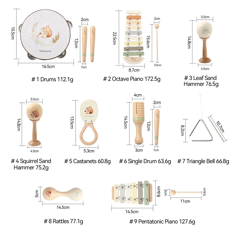 هذه المجموعة الموسيقية الرائعة هي عالم كامل من الاكتشافات الصوتية لطفلك! مصنوعة بعناية من مواد عالية الجودة، تم تصميم كل أداة بدقة لتنمية حب الموسيقى والإبداع لدى الأطفال الصغار بطريقة آمنة وممتعة.