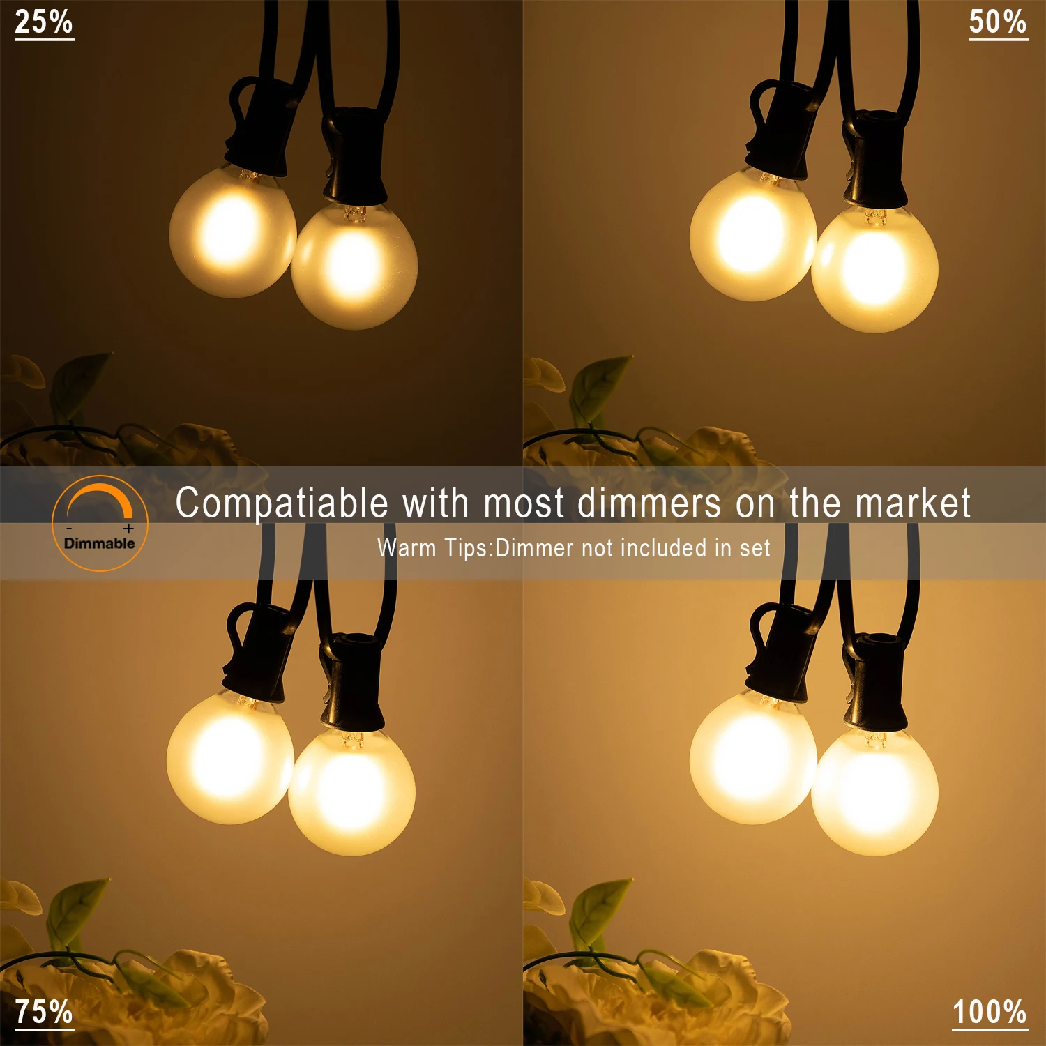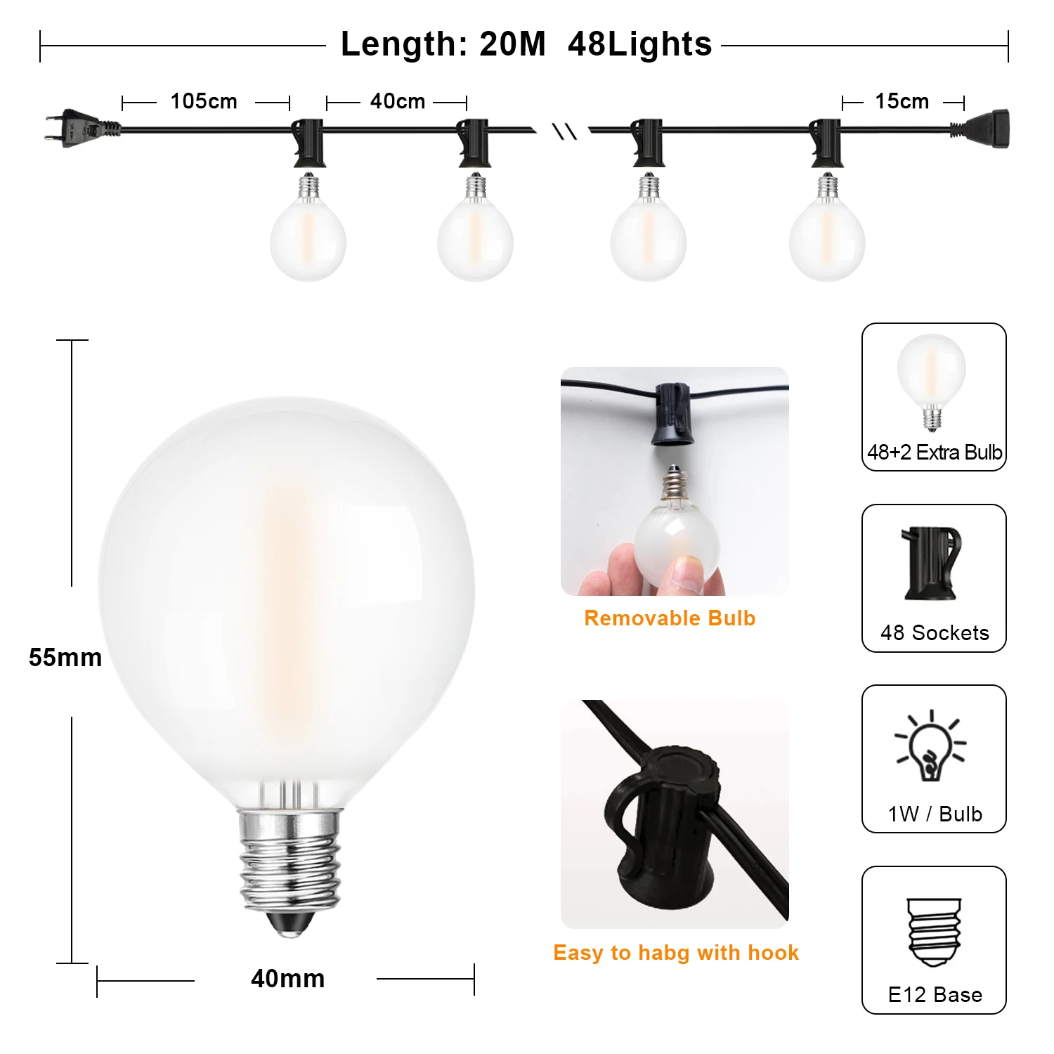 أضواء خرزية خارجية ساحرة بطول 20 متراً، مصممة لتضفي أجواءً رومانسية وأنيقة على مساحاتك الخارجية. تتميز بمصابيح G40 LED معتمة بلون أبيض دافئ، مع خاصية التعتيم والمقاومة للعوامل الجوية، مما يجعلها الحل الأمثل لتزيين الحدائق والأفنية وأماكن الترفيه.