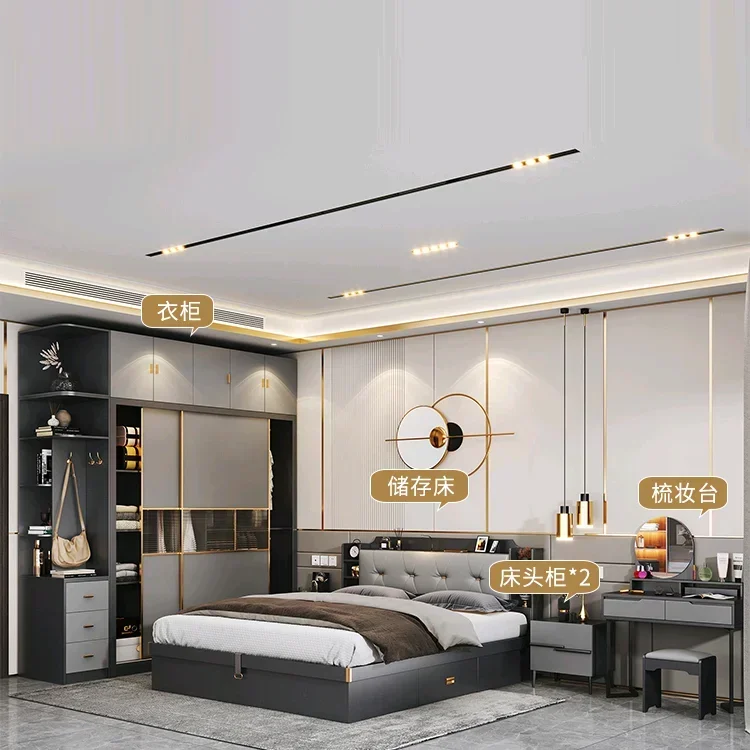 • تشمل سرير مزدوج فاخر، خزانة ملابس، ومنضدة زينة بتصميم عصري يناسب جميع الأذواق.