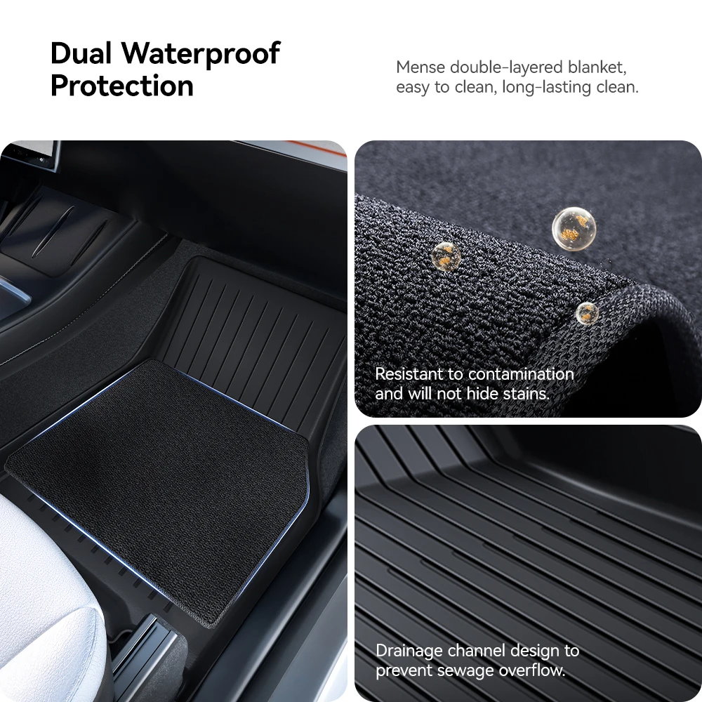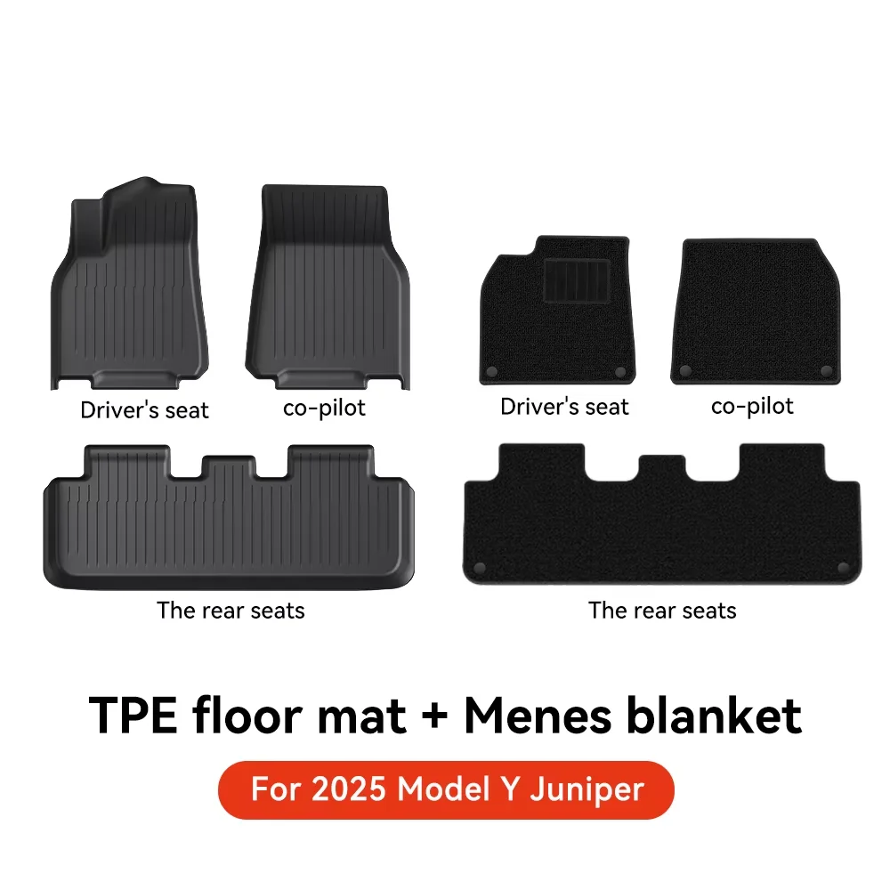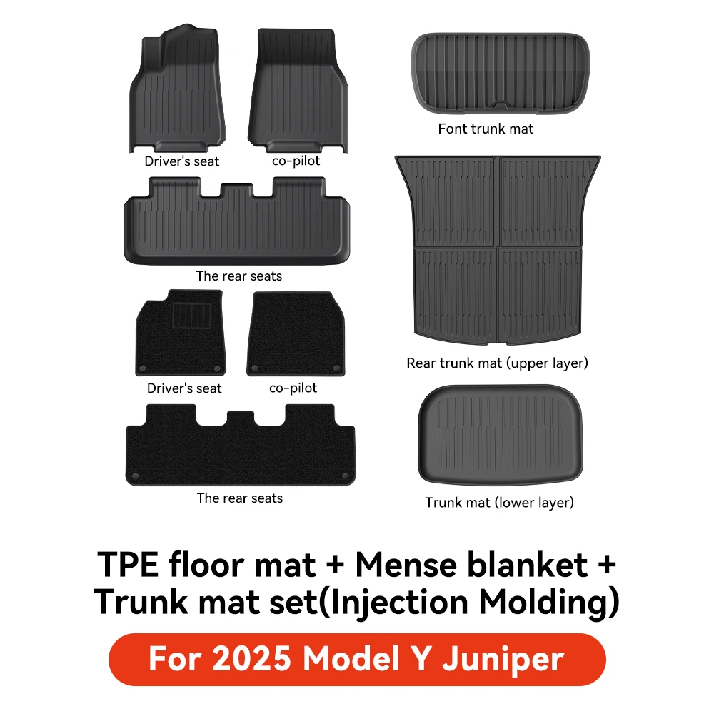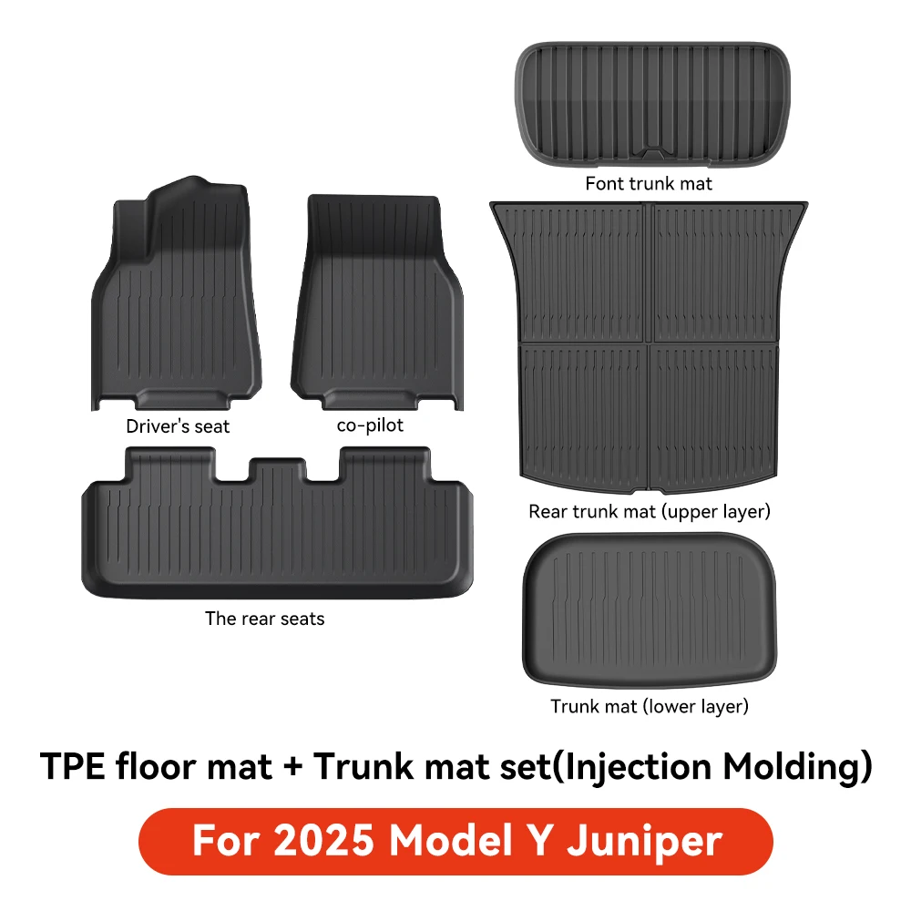 مجموعة بساط أرضية عالية الجودة مصممة خصيصًا لتيسلا موديل واي 2025 (نسخة جونيبر). توفر حماية كاملة للمقصورة الداخلية وصندوق الأمتعة ضد الماء والأوساخ مع الحفاظ على الأناقة والجمال.