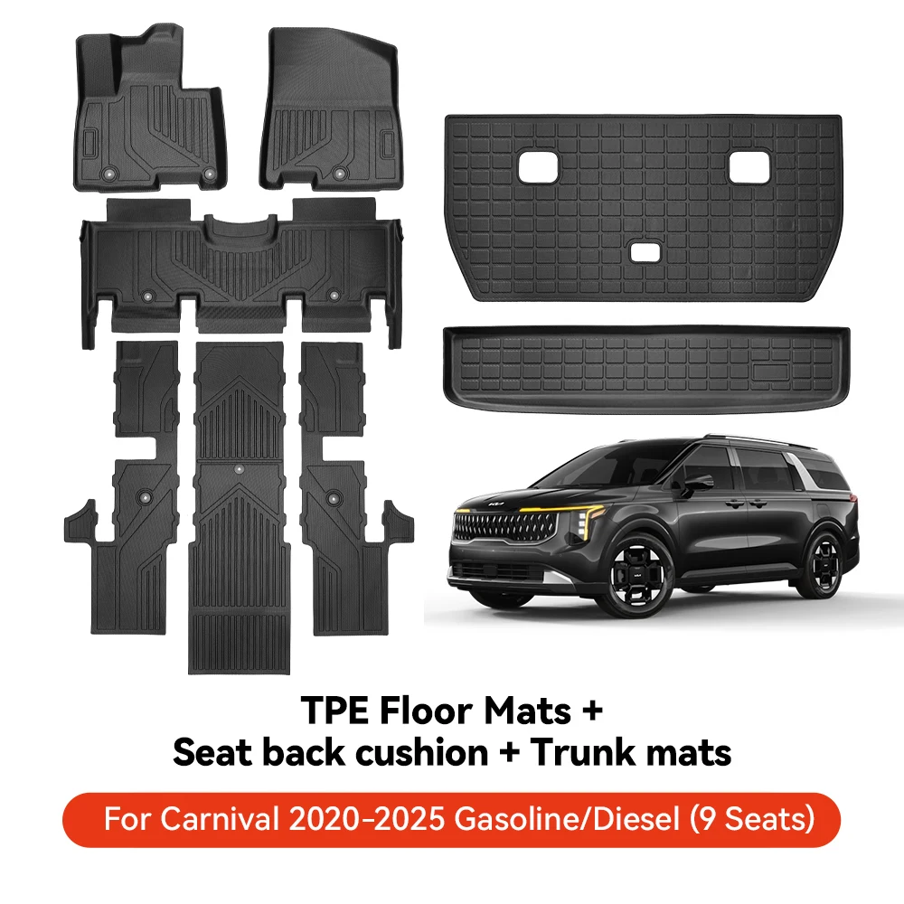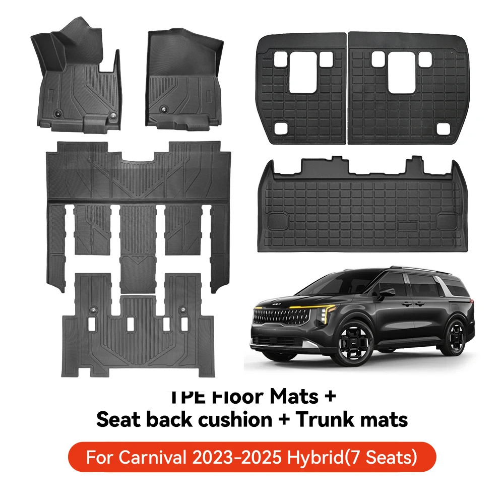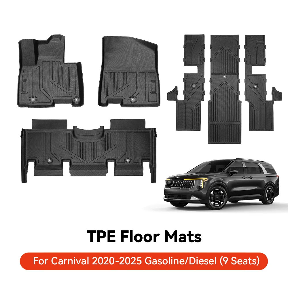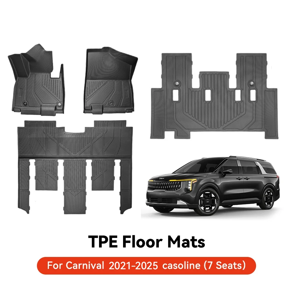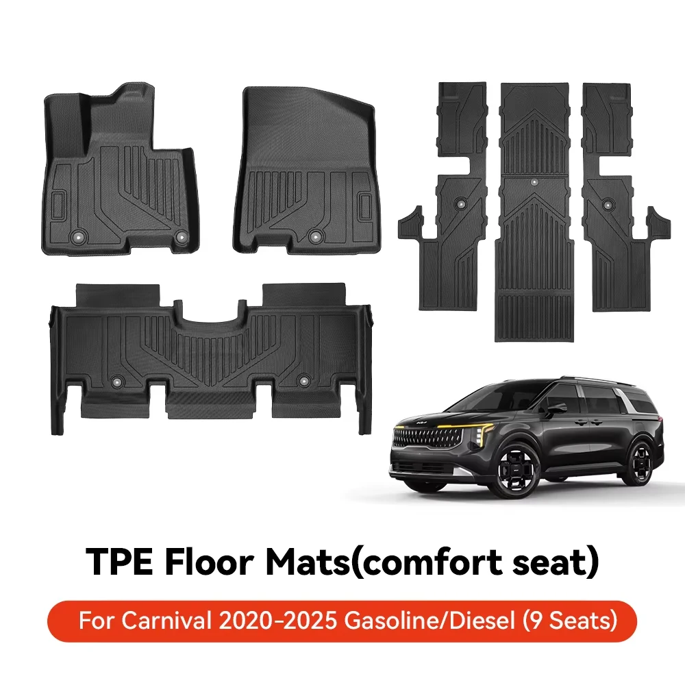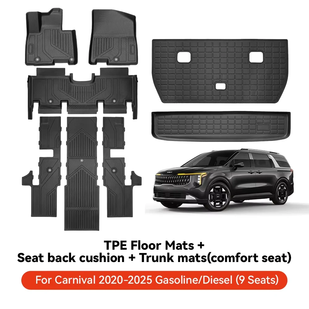 مجموعة بساط أرضية عالية الجودة مصممة خصيصًا لسيارات كيا كارنيفال موديل KA4 (7/8/9 مقاعد). توفر حماية كاملة ضد الماء والأوساخ مع الحفاظ على أناقة المقصورة الداخلية.