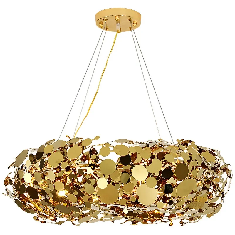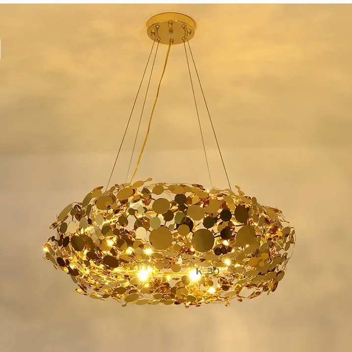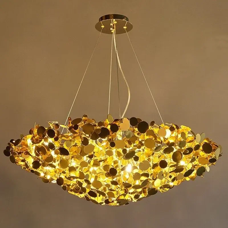 أضفي لمسة من العصرية والأناقة على مساحتك مع ثريا السقف الذهبية المعلقة التي تجمع بين متانة الفولاذ المقاوم وجمال التصميم ما بعد الحديث. تم تصميم هذه القطعة الاستثنائية لتكون بياناً فنياً يضفي الفخامة على أي مساحة، سواء كانت غرفة نومك، مطعمك، متجر الملابس، أو مقهىك المفضل.