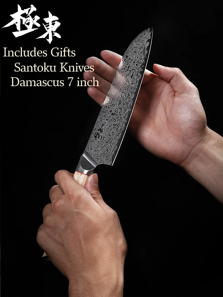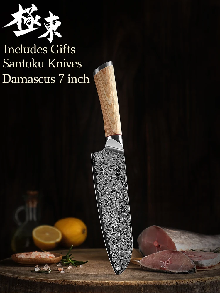 سكاكين مطبخ من الفولاذ المقاوم للصدأ من 67 طبقة باللون الذهبي عيار 10 في دمشق سكاكين للشيف مزودة بأداة تقطيع شريحة لحم السلمون من Gyuto Santoku