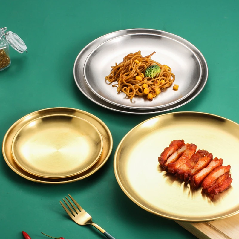 صحن دايرة من الاستانلس ستيل – تصميم ذهبي أو فضي، مناسب لكل أنواع الطعام من الشاورما إلى الحلويات 🥇🍽️✨