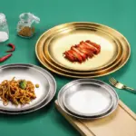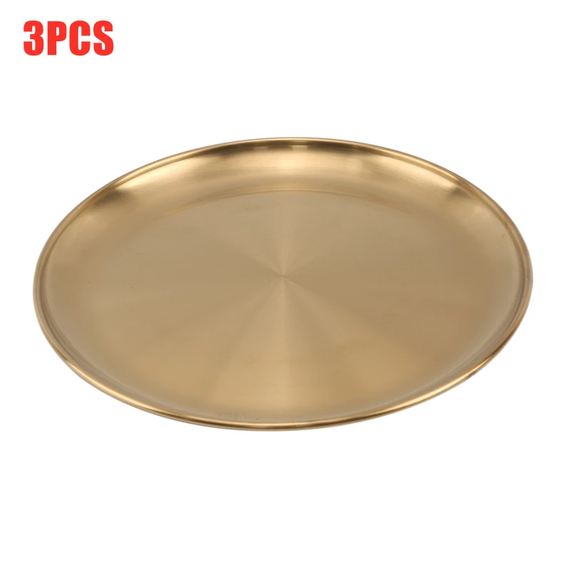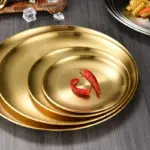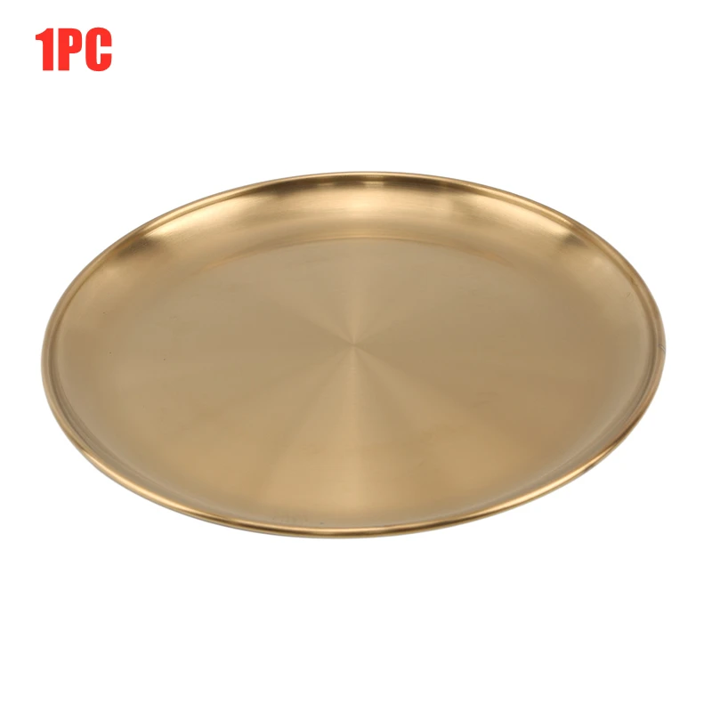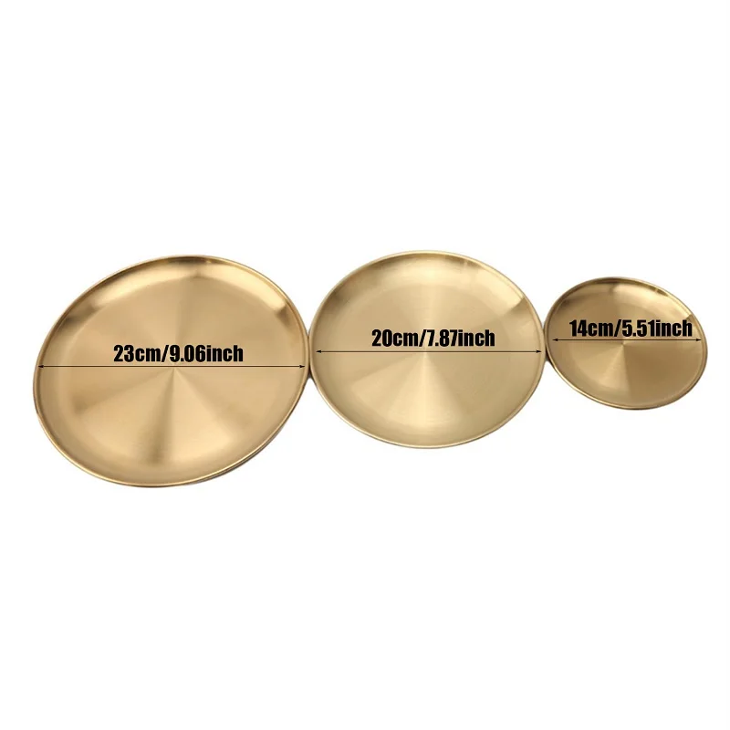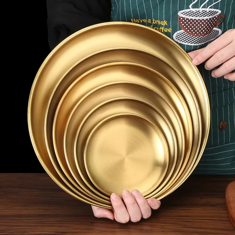 صحن دايرة ذهبي أو فضي من الاستانلس ستيل – 14/20/23 سم، مناسب للحلوى والشاورما والشوي 🥇🍽️🔥