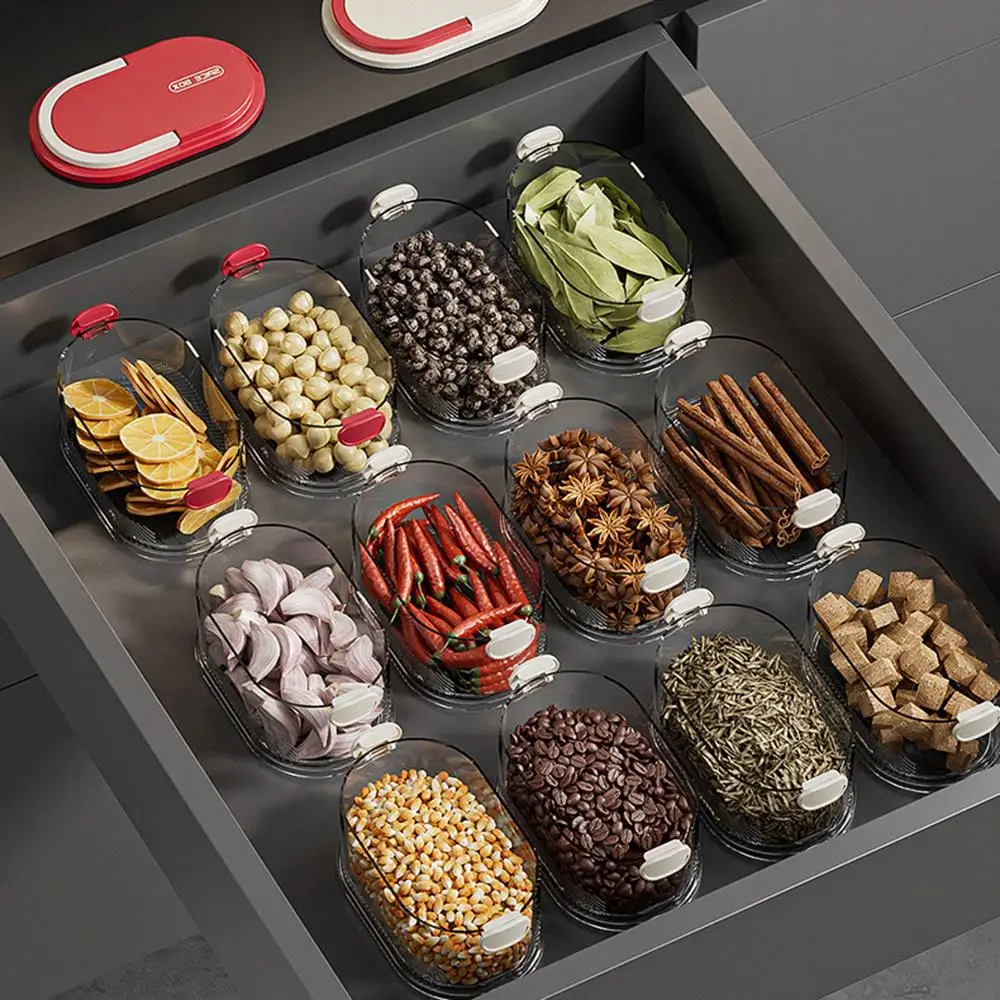 التصميم المحكم يمنع دخول الغبار والرطوبة ، ويضمن لك بقاء كل شيء طازج لأطول فترة ممكنة. مناسب لتخزين التوابل، الملح، السكر، الشطة، البقوليات، وحتى المواد الحساسة مثل الشاي أو القهوة.