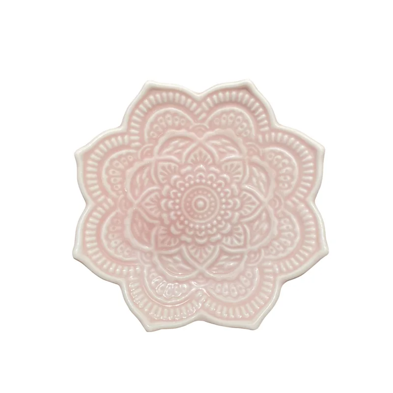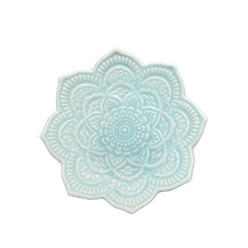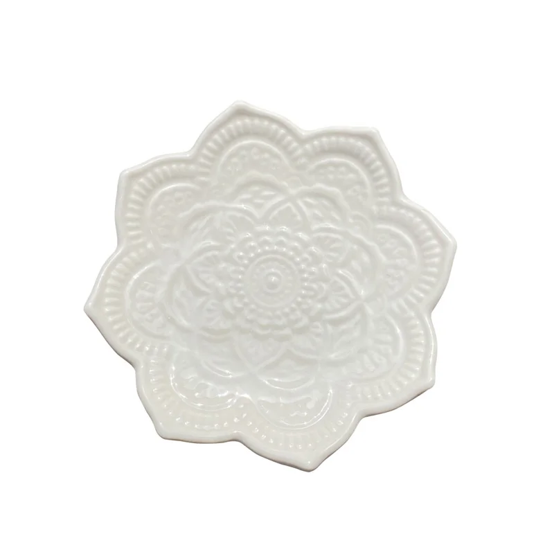 طبق خزفي صغير مزيناً بتصميم نباتي – مناسب لتقديم الحلويات، القهوة، أو كقطعة ديكورية فاخرة 🍵🪴✨