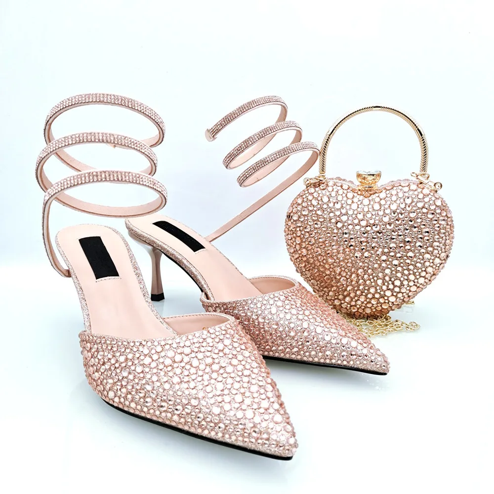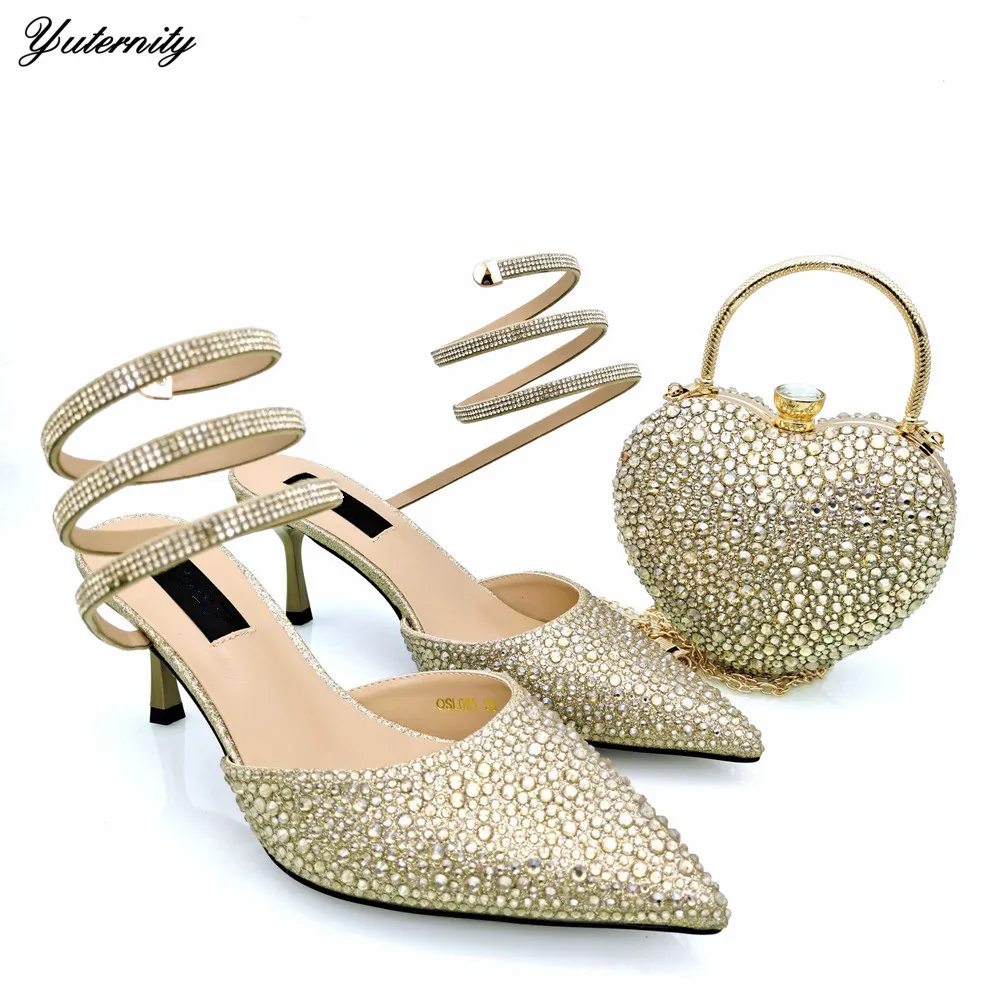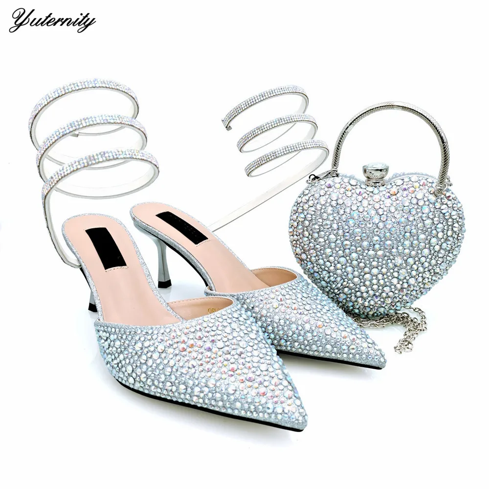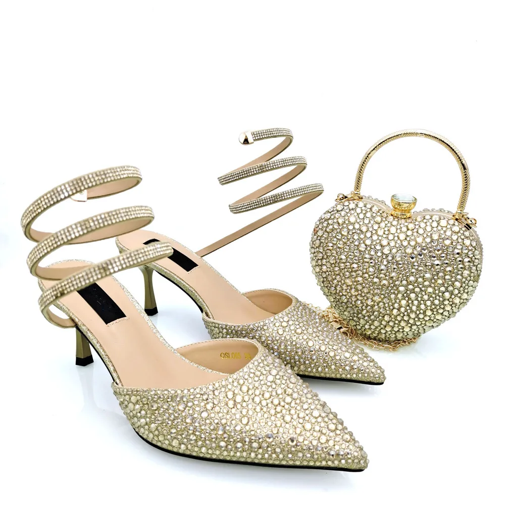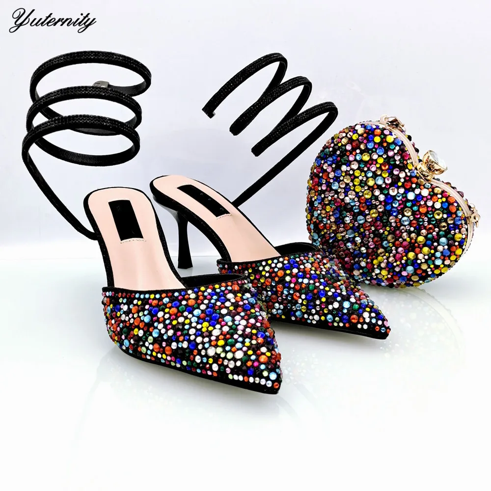طقم فاخر للنساء: حذاء بكعب مربع وحقيبة يد بتصميم إيطالي وأفريقي عصري مع تطريز بلوري وتصميم مموه جذاب