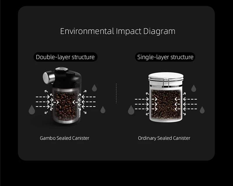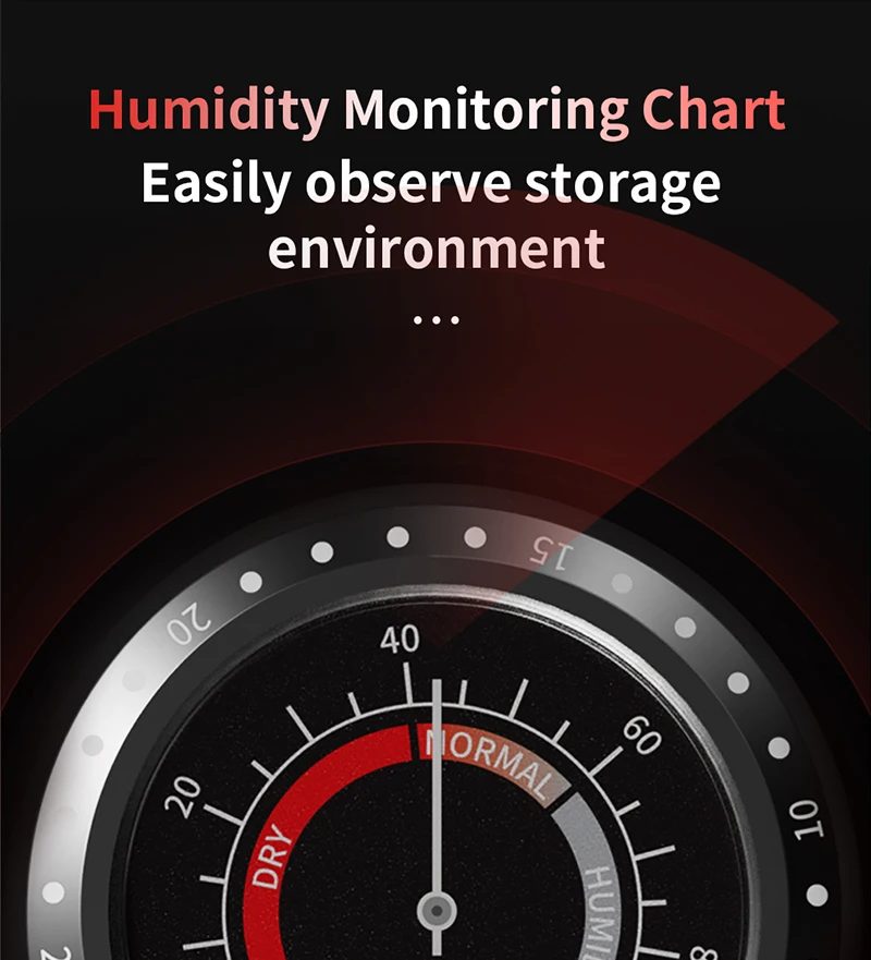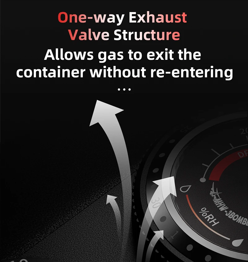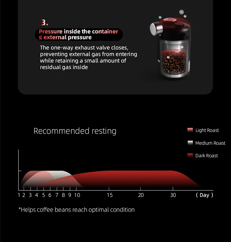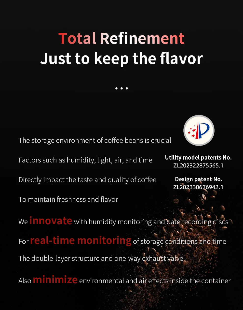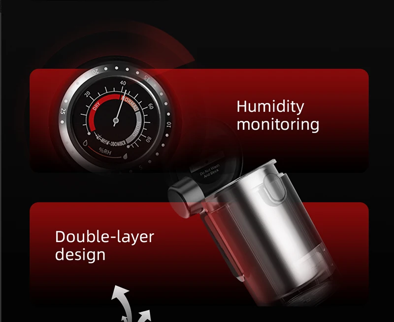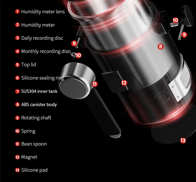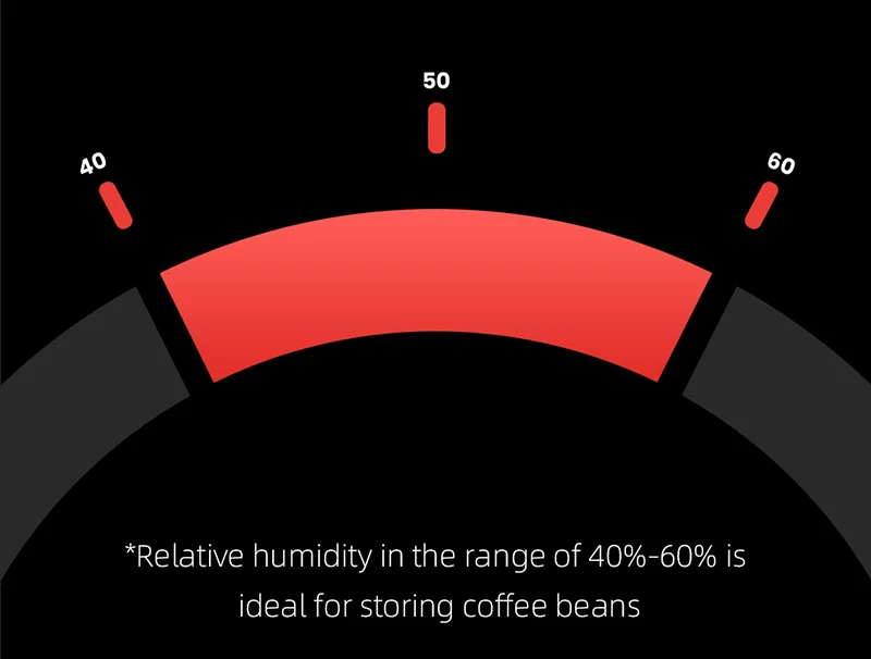 مؤشر رطوبة داخلي : لمراقبة مستوى الرطوبة داخل العلبة، ومعرفة إذا كانت البيئة المناسبة (40–60%) متوفرة لتخزين البن