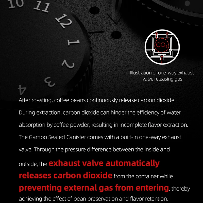 صمام تنفس أحادي الاتجاه : يسمح بخروج غاز الكربون الناتج عن البن بعد التحميص، ومانع دخول الهواء الخارجي