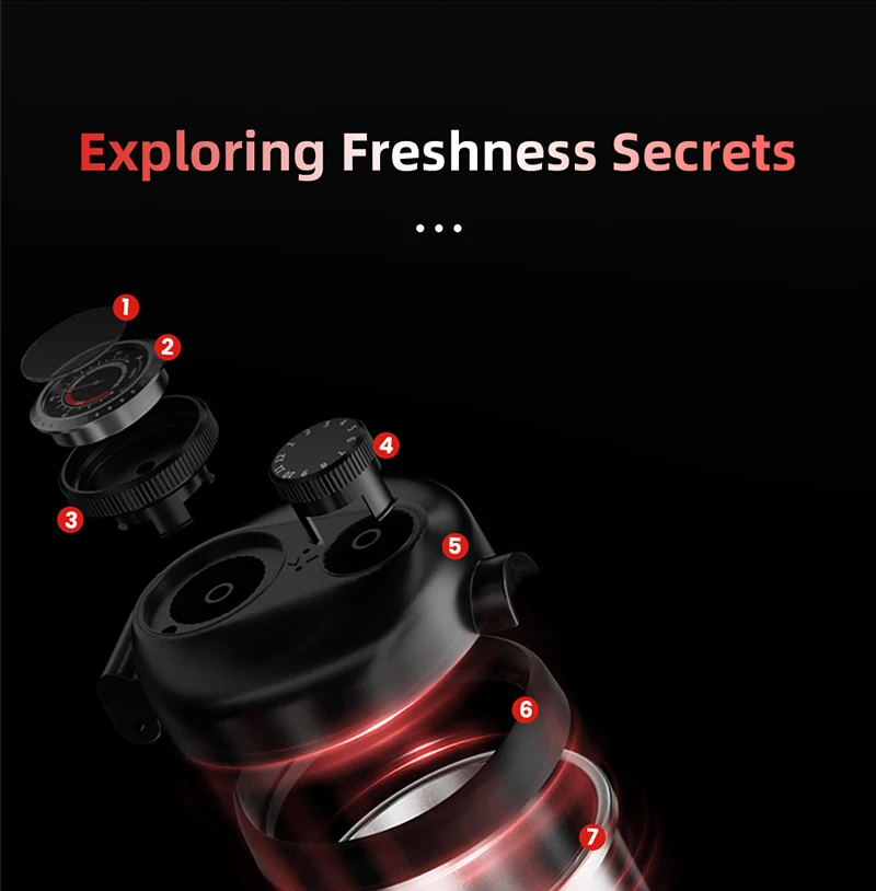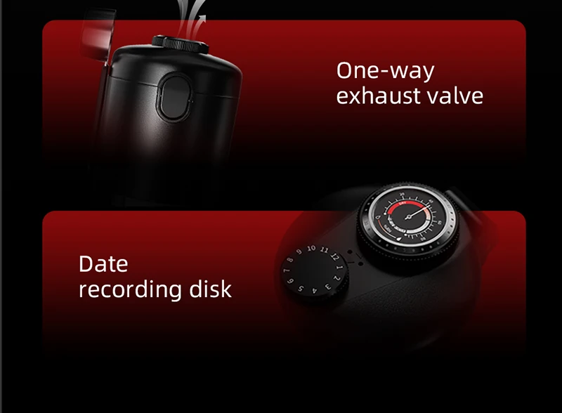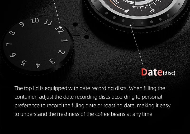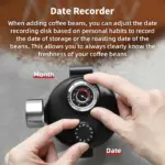 مؤشر تواريخ دوار : تسجل فيه تاريخ التخزين أو الانتهاء، عشان تتأكد أن البن ما طال عليه الزمن