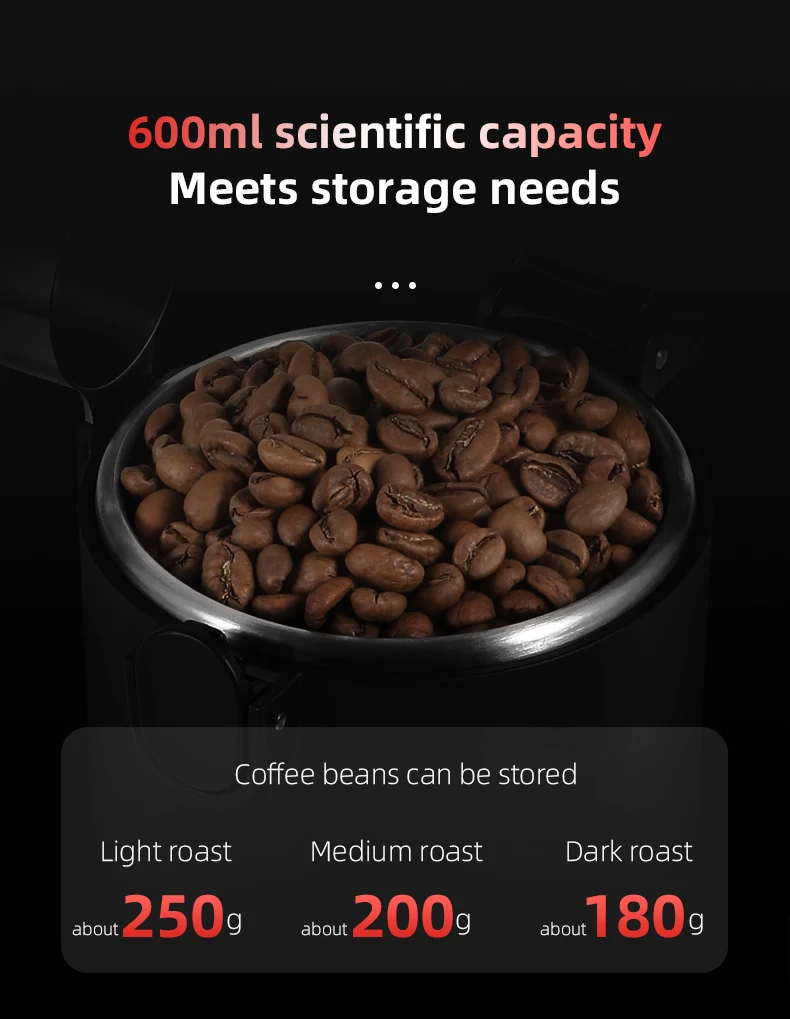 سعة عملية : 600 مل — تحمل بين 200–250 غرام من البن ، تعادل تقريبًا 40 كوب قهوة!
