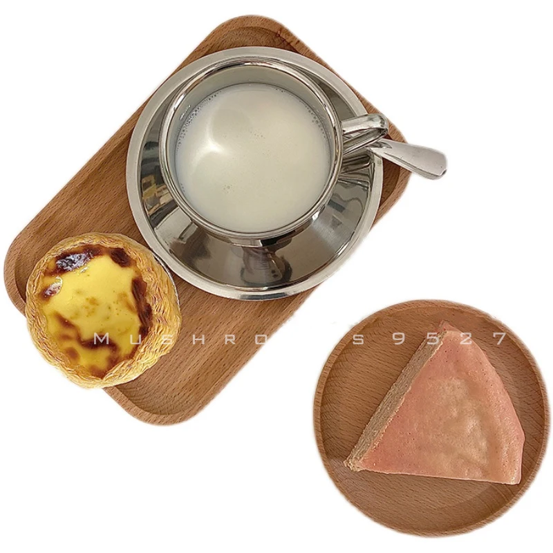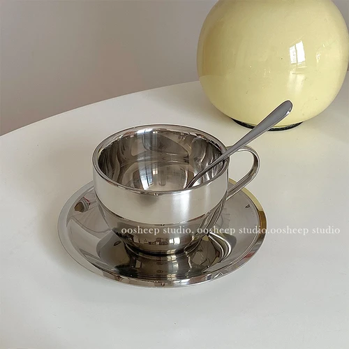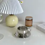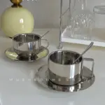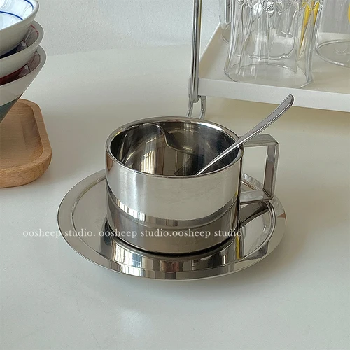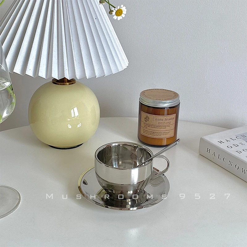 كوب قهوة كوري أنيق مع صحن – تصميم رجعي صغير فاخر | كوب ستانلس ستيل مع طقم ضيافة – مناسب لل_vlog وجلسة الشاي