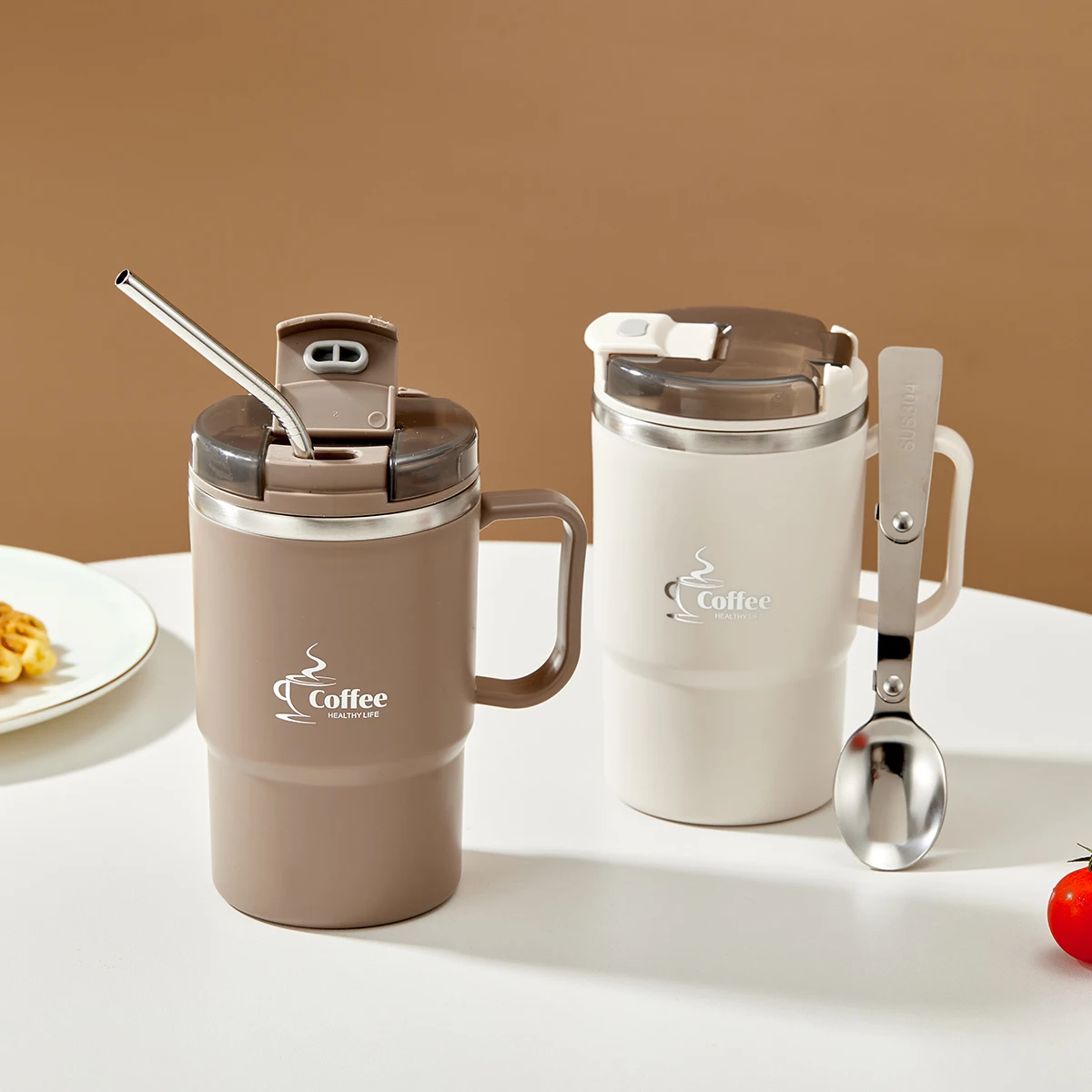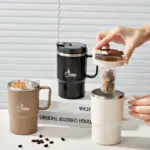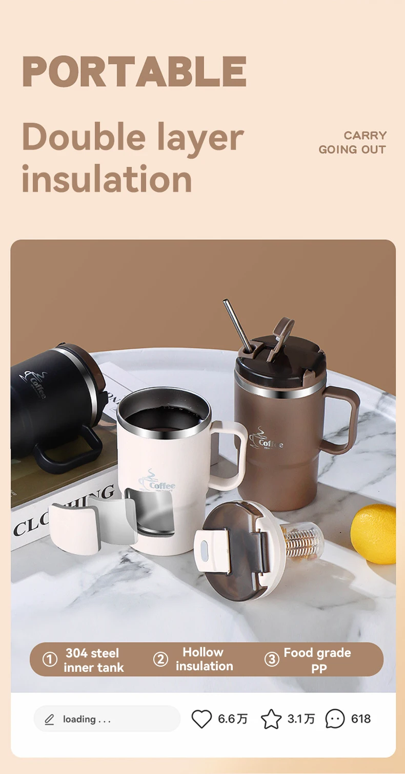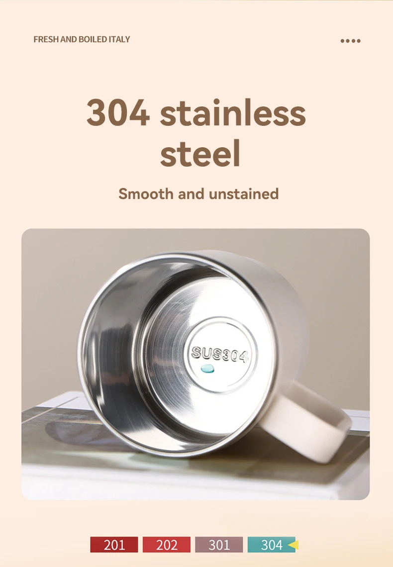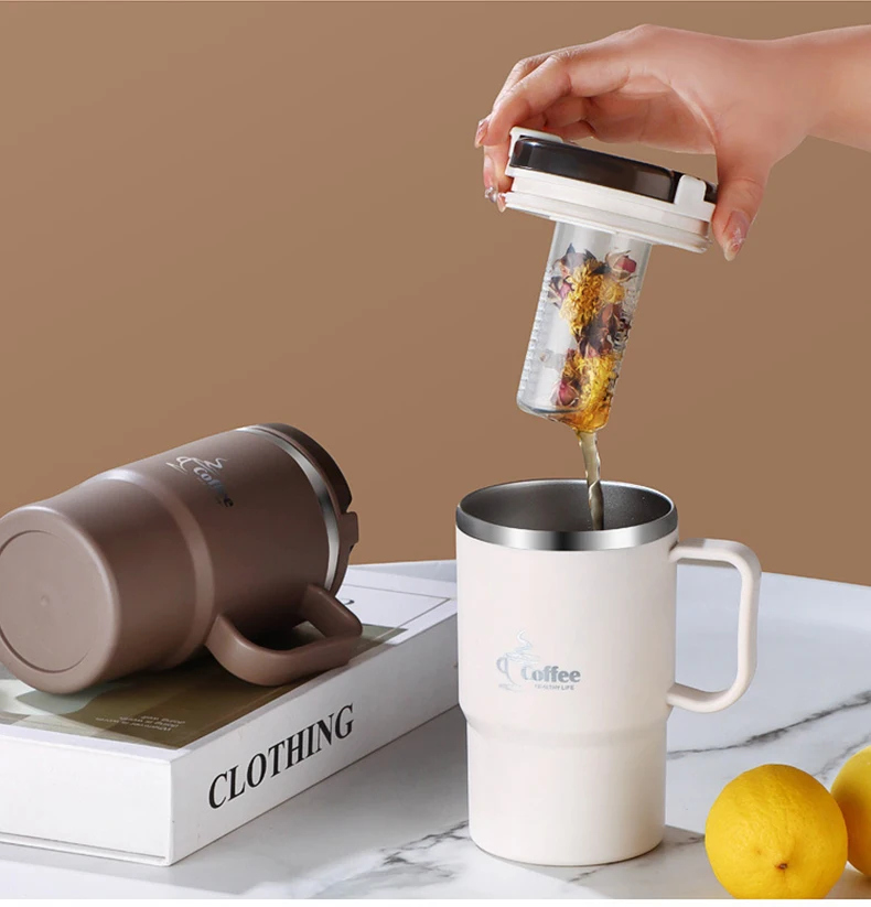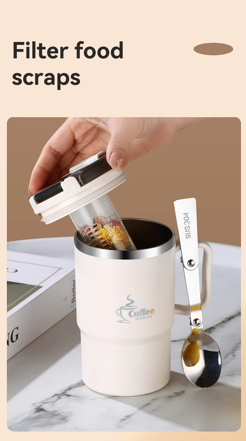 كوب قهوة معزول حراريًا مزدوج الجدار 304 كوب ماء من الفولاذ المقاوم للصدأ مع ملعقة ومصفاة شاي