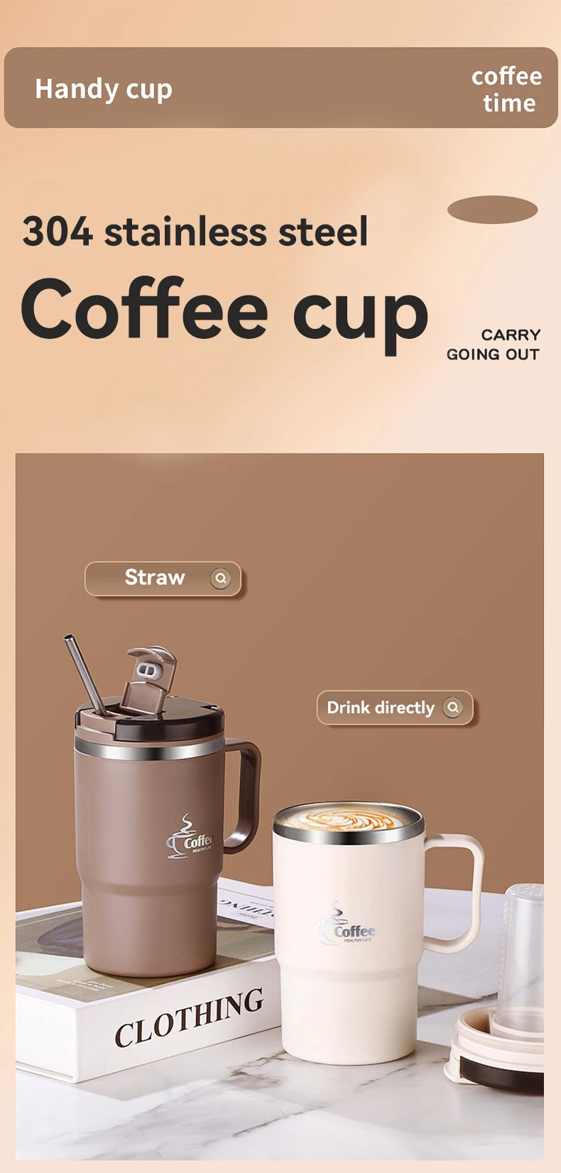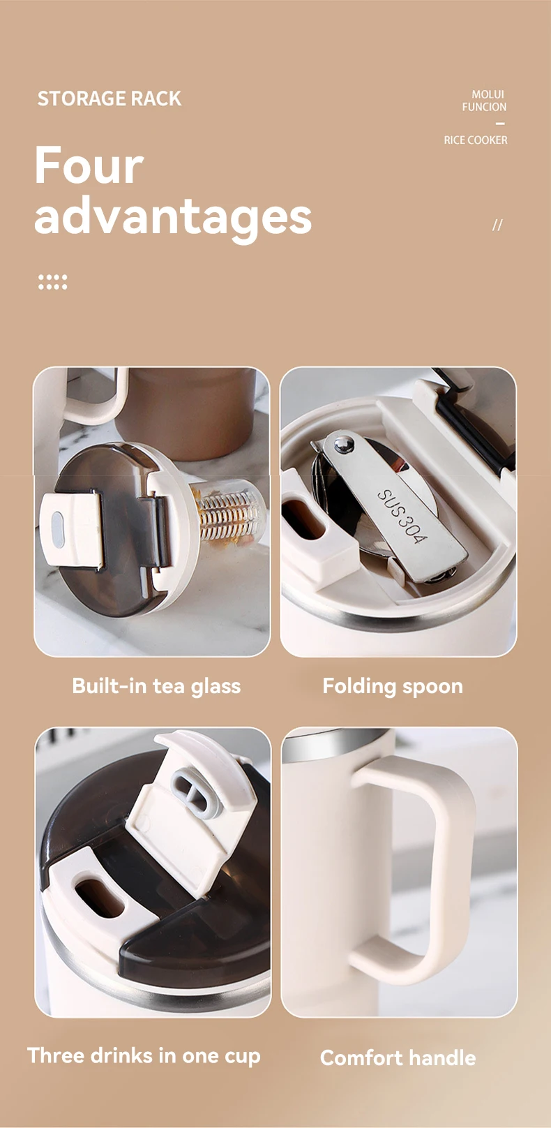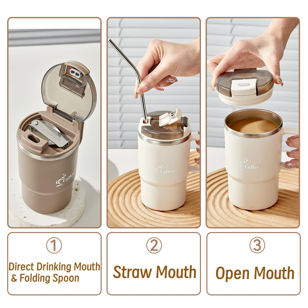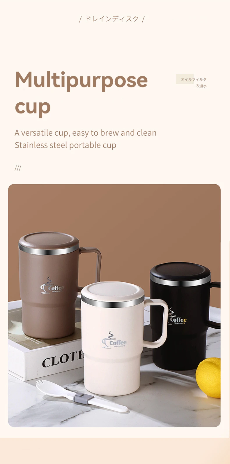 كوب قهوة معزول حراريًا مزدوج الجدار 304 كوب ماء من الفولاذ المقاوم للصدأ مع ملعقة ومصفاة شاي