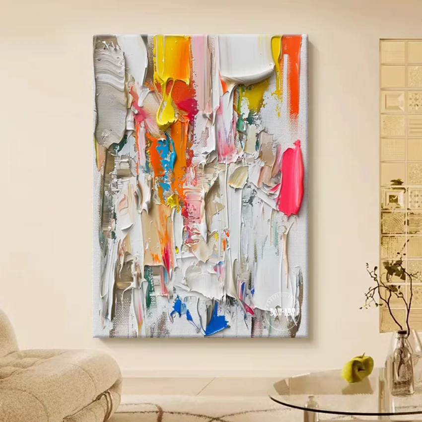 تمثّل هذه اللوحة عملاً فنيًا يدويًا 100%، ومبنية على فكرة التجريد الحديث، مما يجعلها مناسبة تمامًا للديكور الداخلي العصري. الألوان الزاهية والخطوط الحرة تعطي انطباعًا جماليًا يتناغم مع المساحات الحيوية.