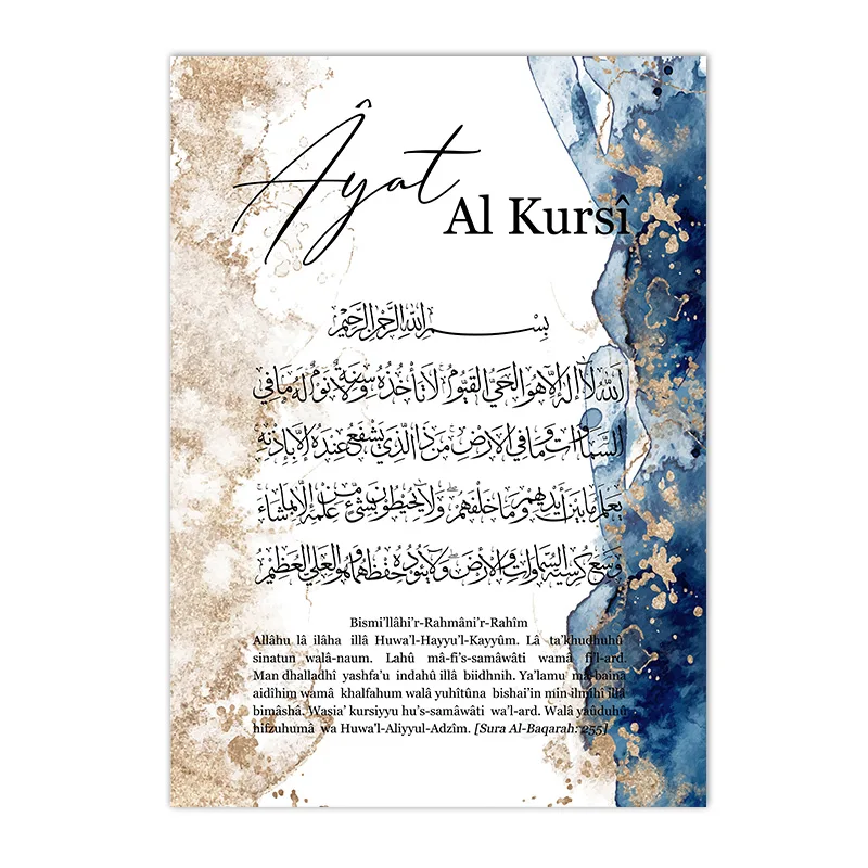 ملصق خط إسلامي ديني حديث باللون البيج والأزرق، لوحة قماشية تجريدية لآية الكرسي