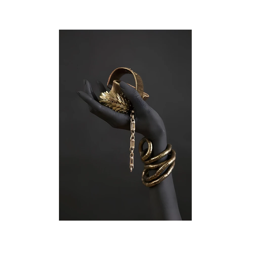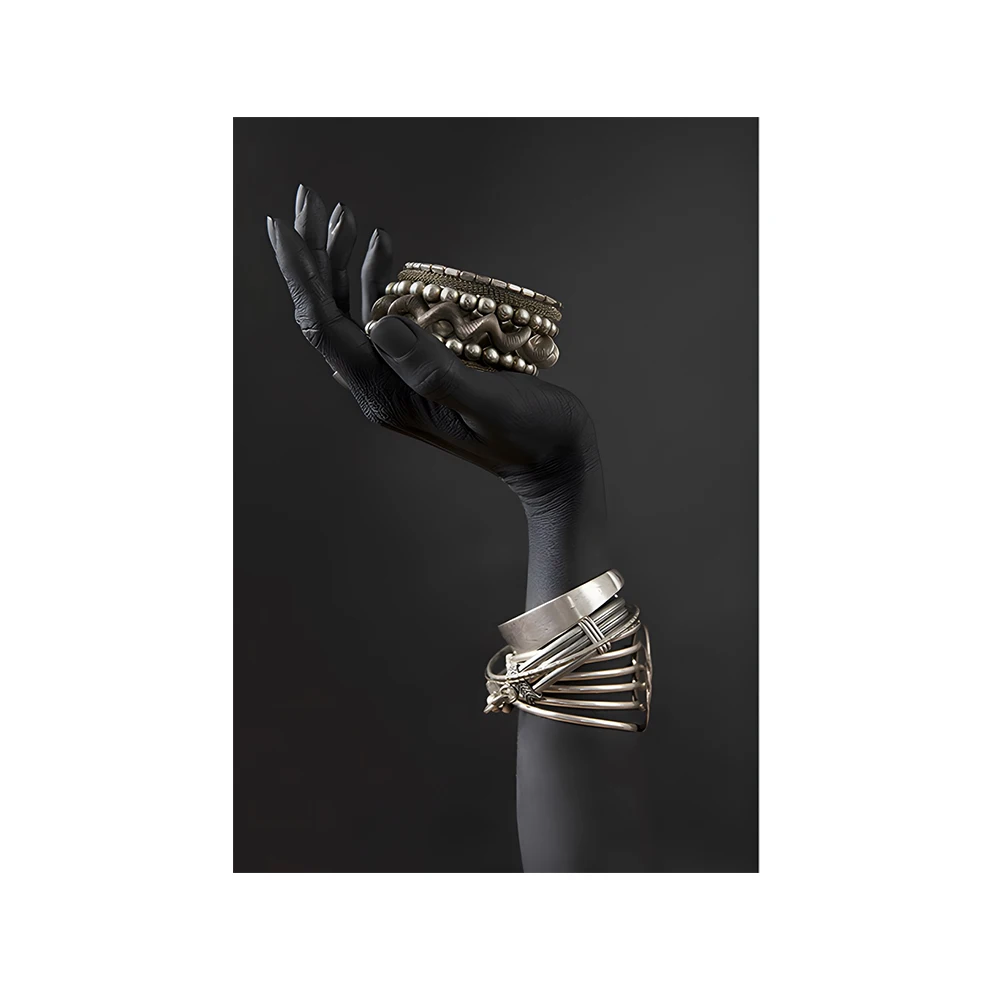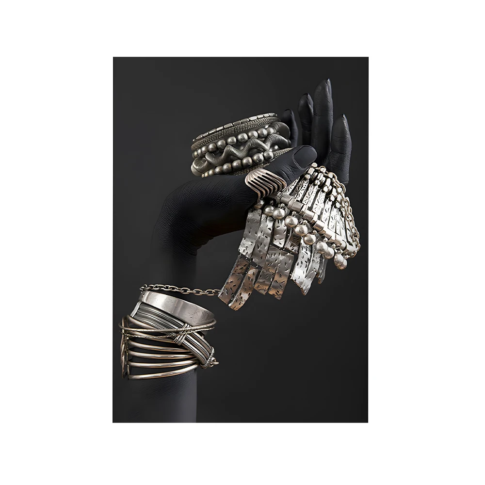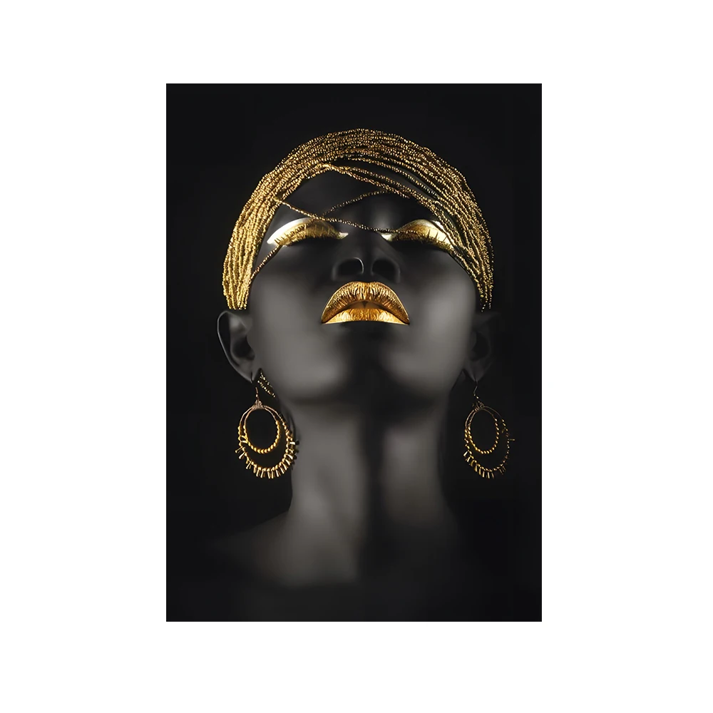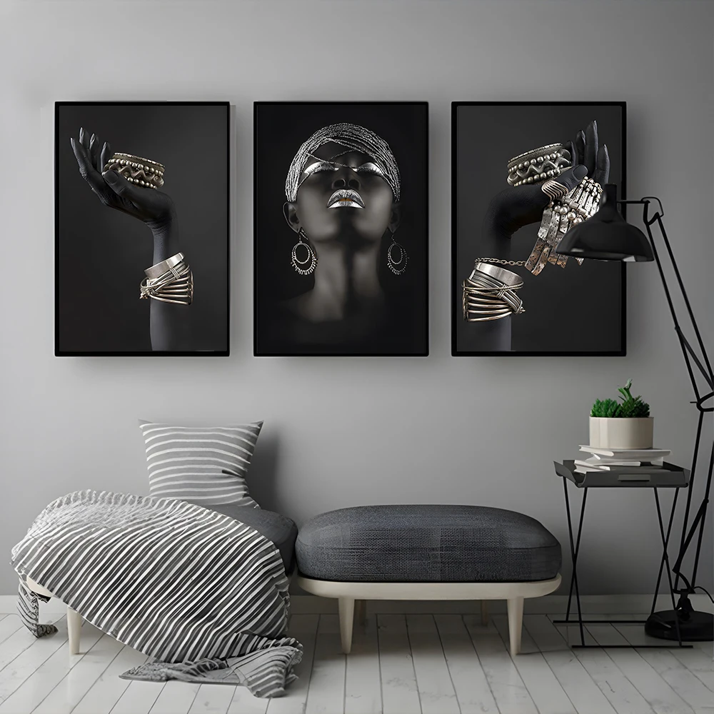 وحة فنية جدارية لخلفية منزل امرأة أفريقية مصنوعة من القماش ومجوهرات ذهبية وفضية في متناول اليد وملصقات مطبوعة