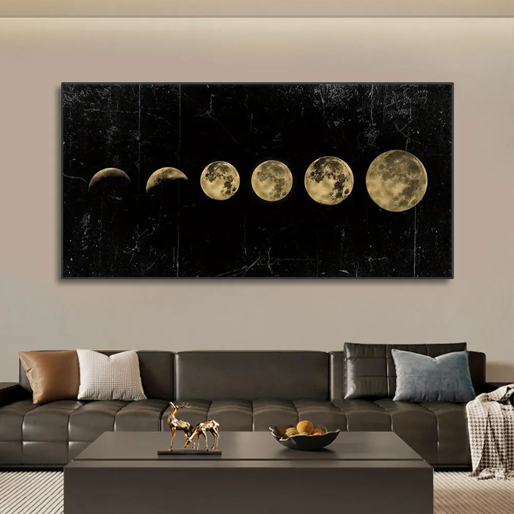وحة فنية جدارية لمرحلة القمر باللون الذهبي والأسود، مطبوعة على قماش، لوحة تجريدية، صورة جدارية لغرفة المعيشة وديكور المنزل