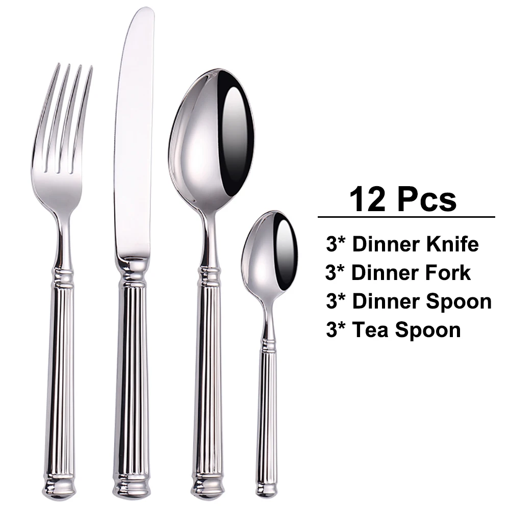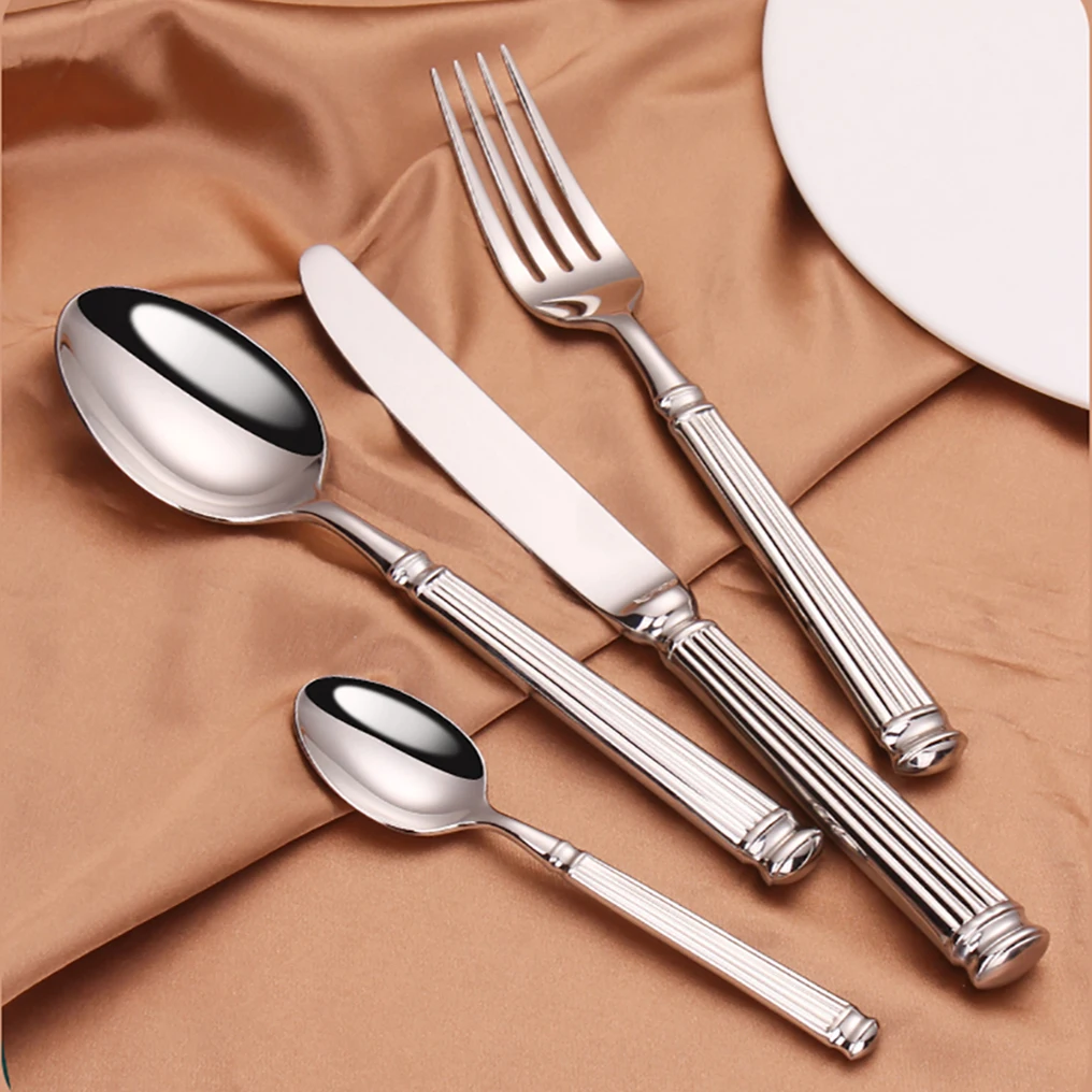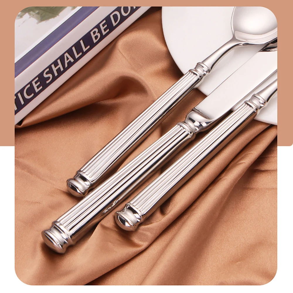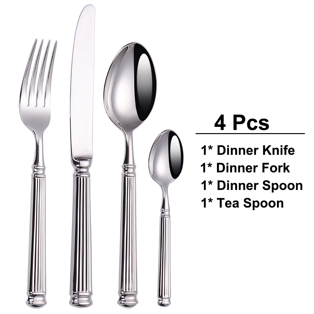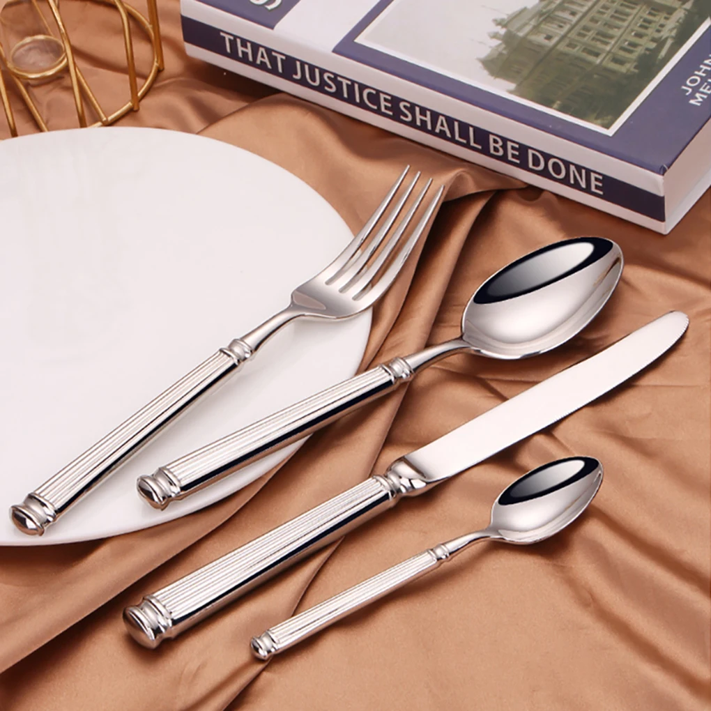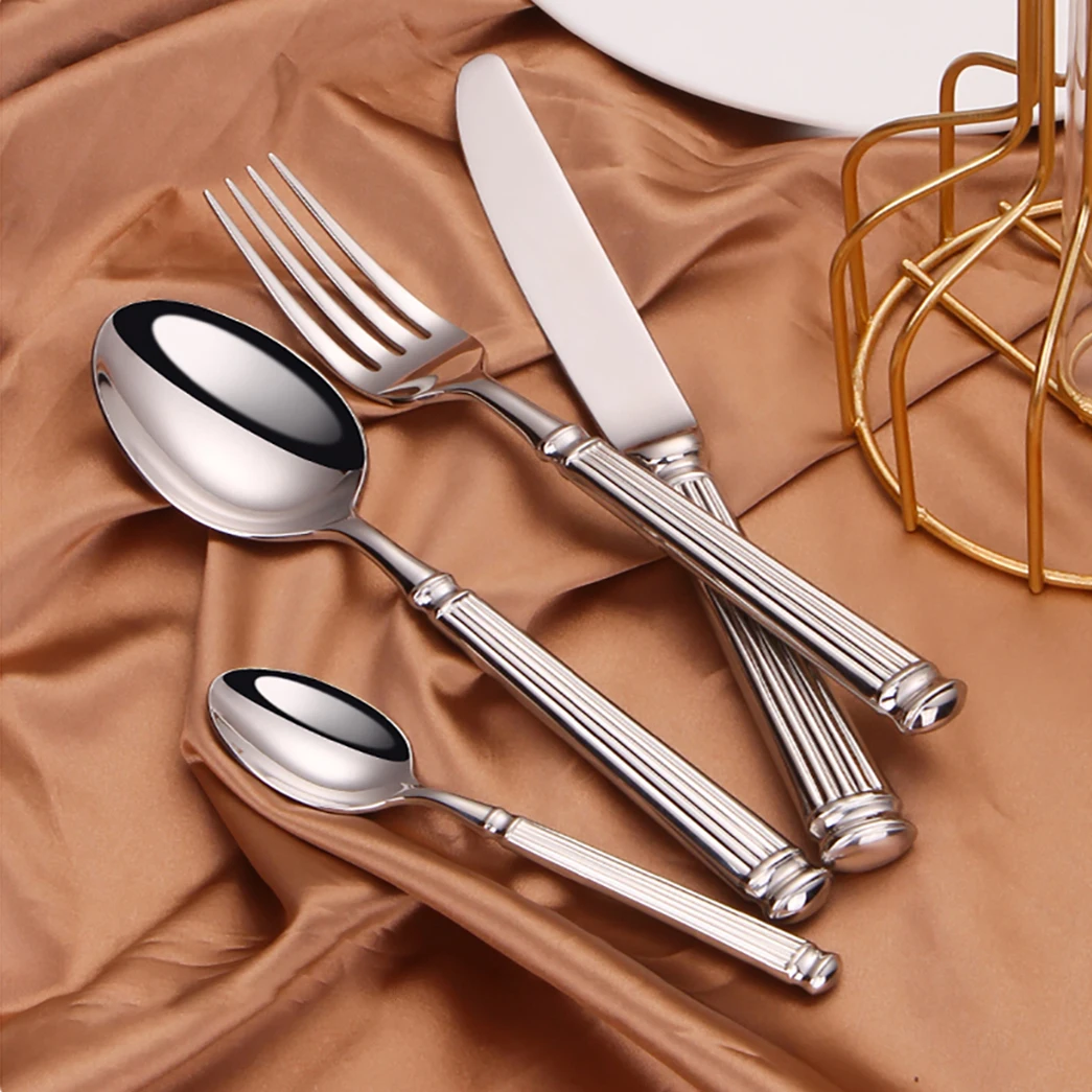 🥄🍴 مجموعة أدوات طاولة فضية 4 إلى 16 قطعة | تصميم أنيق بنمط شرائطي | من الاستانلس ستيل 304